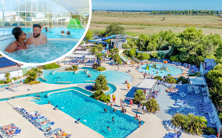 Un superbe espace aquatique de 800m², toboggans, banquettes massantes, jacuzzi, rivière, sauna (en supplément d'avril à septembre), s'offrent à vous et votre famille dans un cadre grandiose.
